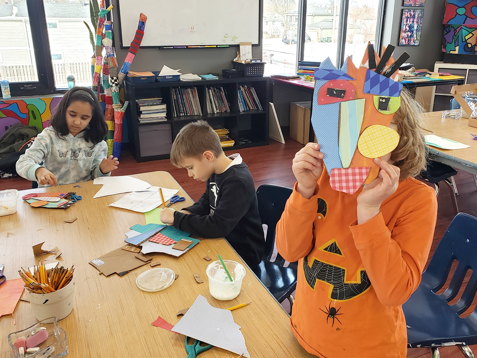 The art room has felt especially alive this month. Our second graders leaned into playful experimentation, cutting cardboard and patterned papers to build wonderfully asymmetrical faces. Through thoughtful choices, students discovered that a piece can feel balanced without being perfectly symmetrical.