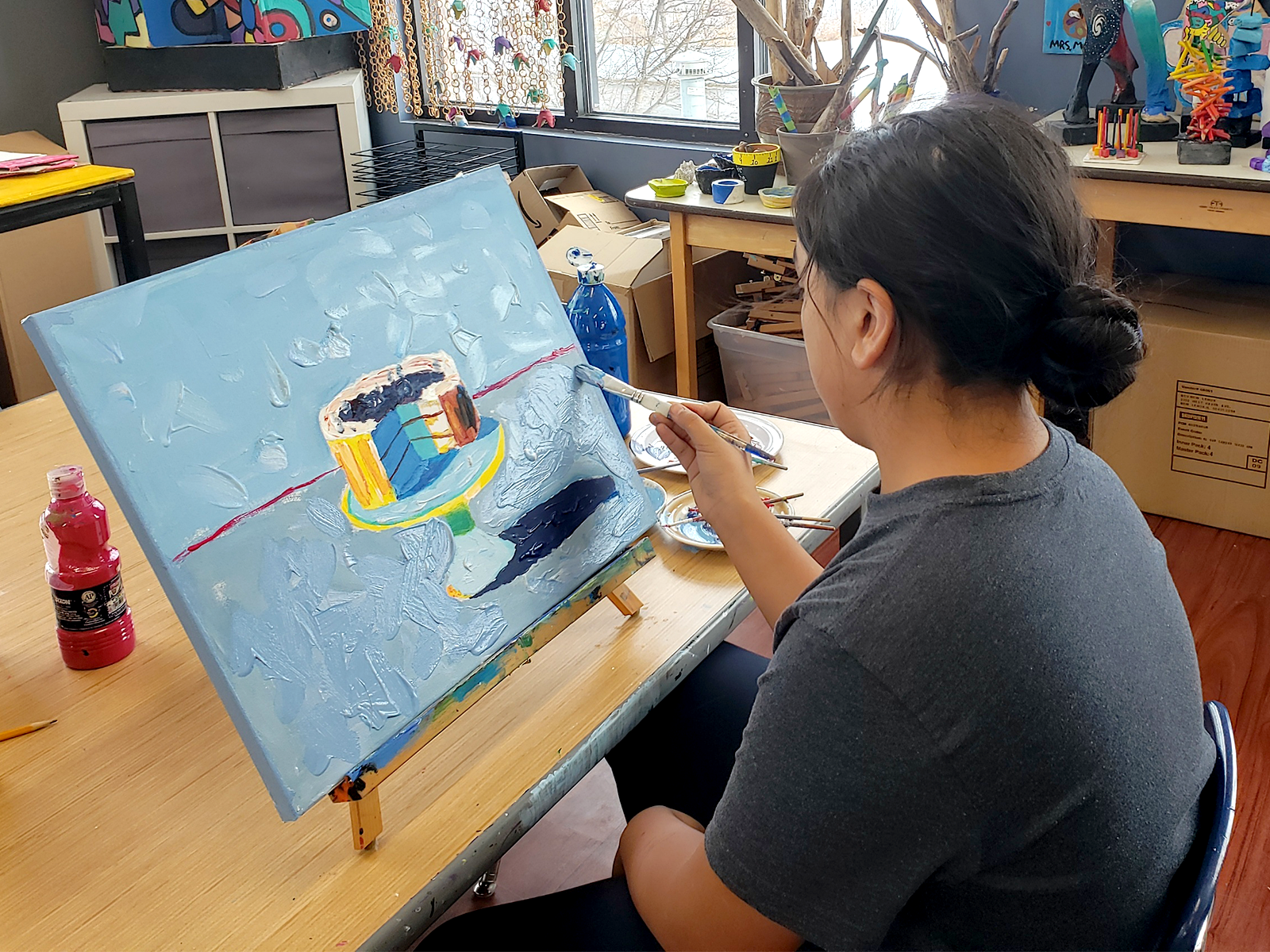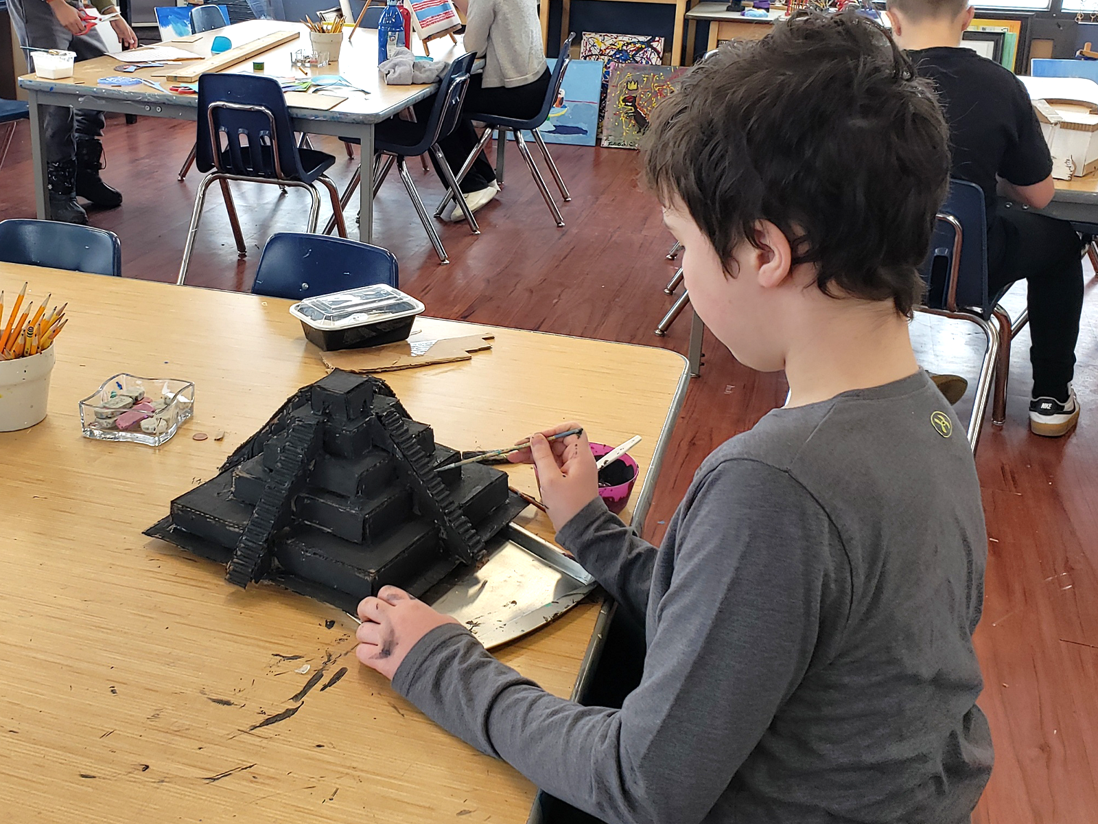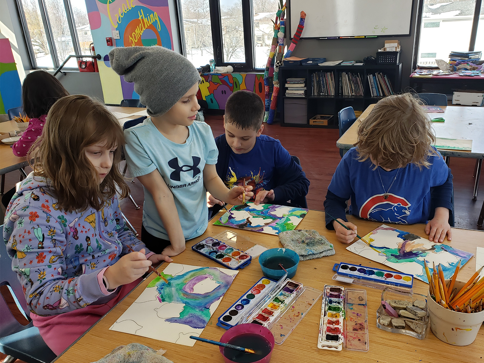 Some upper elementary students are preparing artwork for International Day on March 14. Inspired by North American culture, they are drawing from architecture, artists, landmarks, traditions, and everyday life across the region. Students are also creating a collaborative piece to be auctioned at International Day. Inspired by Vincent van Gogh’s Almond Blossoms, the canvas was divided into small squares so each child could carefully paint a section, symbolizing hope and new life.