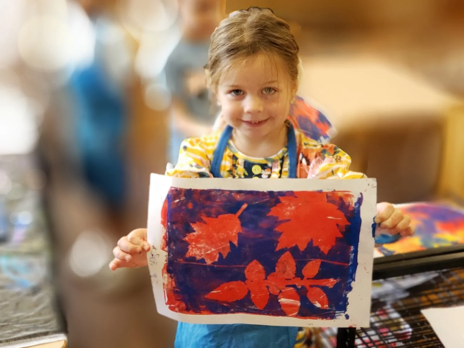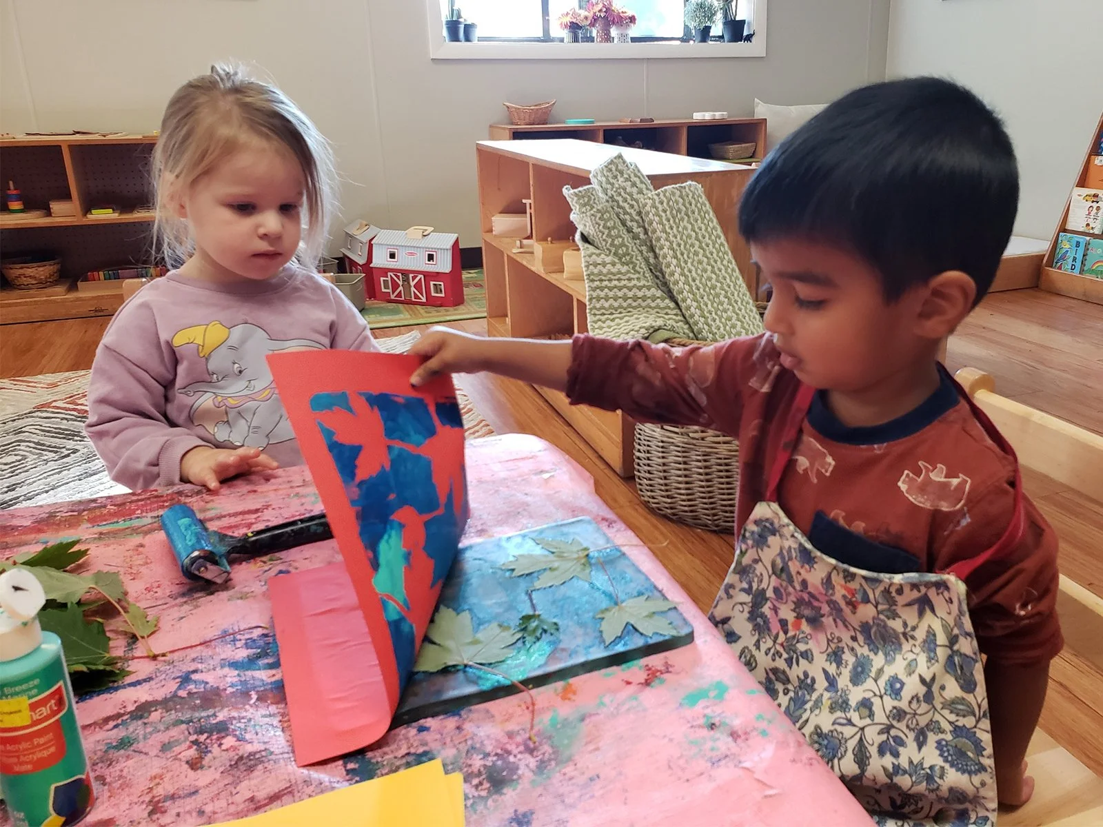 Our Toddler and Primary students explored the colors of fall through leaf monoprints, rolling paint across printing plates and pressing real leaves to capture their delicate shapes. The children delighted in discovering that each print was a one-of-a-kind creation.
